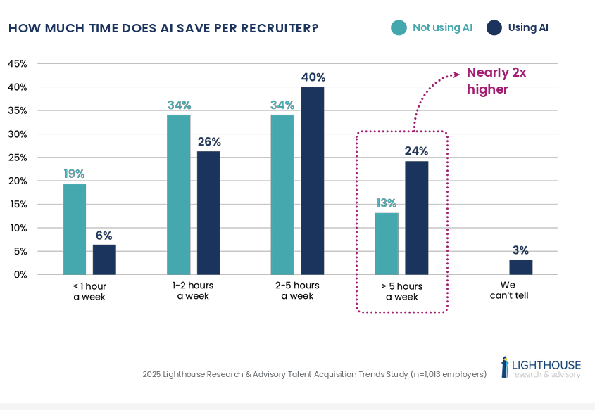 Connors was quick to highlight the results of this customer survey designed as a research report, particularly a benchmark stat that also makes for a pretty compelling business case: 55% of employers using AI in recruiting (beware round numbers in survey results) say that it saves them at least two hours a hire, with some respondents reporting time savings of up to five hours, on average.