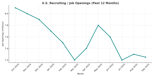 Unemployment, at 4.1%, is still historically low. But that stat hides a more interesting trend: the number of job openings has fallen below 8.5 million for the first time since 2021, while the number of hires and voluntary quits are also declining. That’s not just cooling—it’s calcifying.