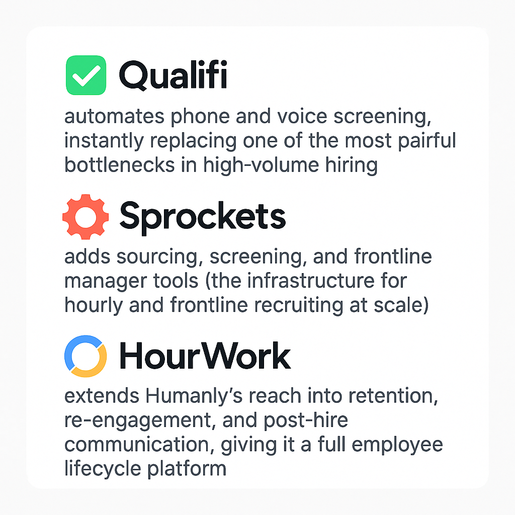- HourWork extends Humanly’s reach into retention, re-engagement, and post-hire communication, giving it a full employee lifecycle platform.