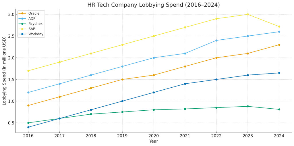 SAP and Workday cultivated bipartisan credibility. In 2024, SAP spent $2.72 million on lobbying. Workday split its donations evenly across party lines, supporting both DNC and RNC-aligned candidates.