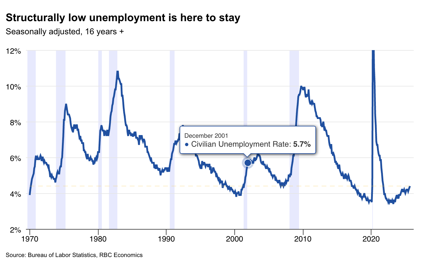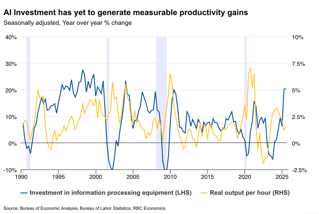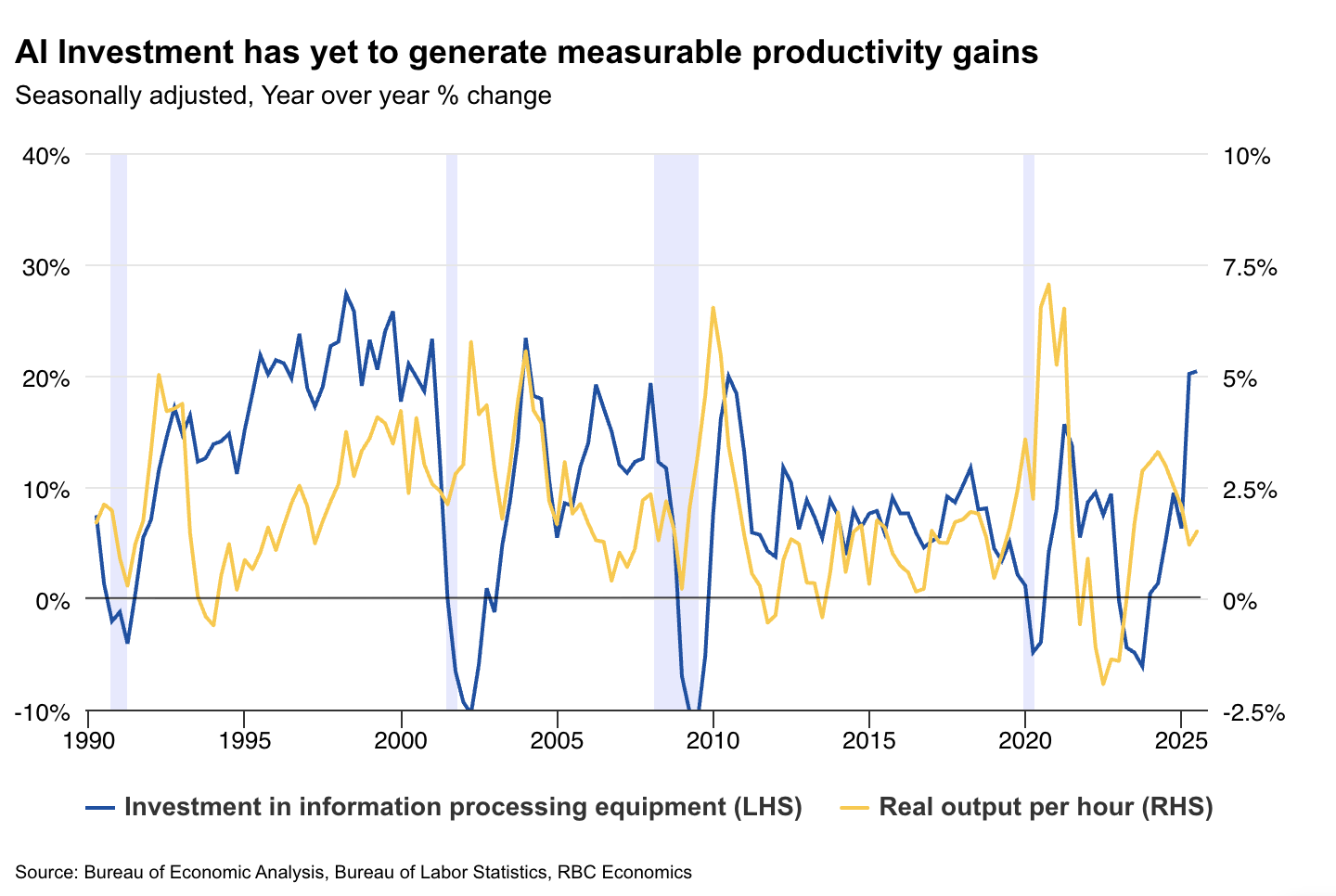 Goldman is actually on the optimistic side of the equation; the Royal Bank of Canada, for example, is downright skeptical and inherently cynical about AI’s impact (sorry, eh). In a recent report, they note that despite hundreds of billions of dollars in AI investment to date, there is no statistical correlation with improved productivity, much less clear justification for that investment in terms of economic impact.